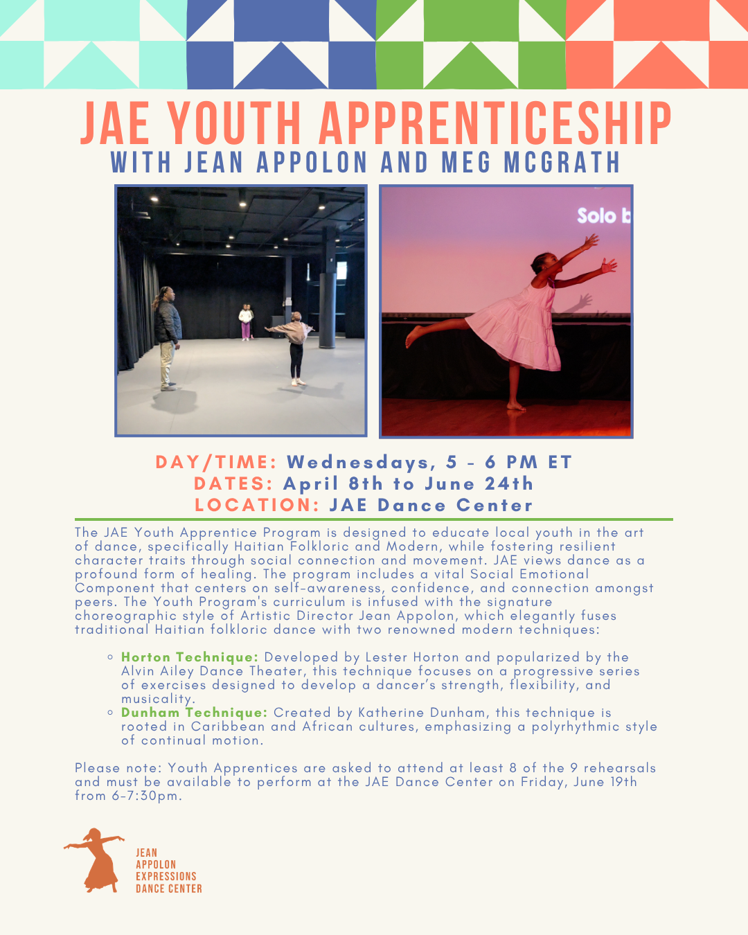 Description: The JAE Youth Apprentice Program is designed to educate local youth in the art of dance, specifically Haitian Folkloric and Modern, while fostering resilient character traits through social connection and movement. JAE views dance as a profound form of healing. The program includes a vital Social Emotional Component that centers on self-awareness, confidence, and connection amongst peers. The Youth Program's curriculum is infused with the signature choreographic style of Artistic Director Jean Appolon, which elegantly fuses traditional Haitian folkloric dance with two renowned modern techniques: